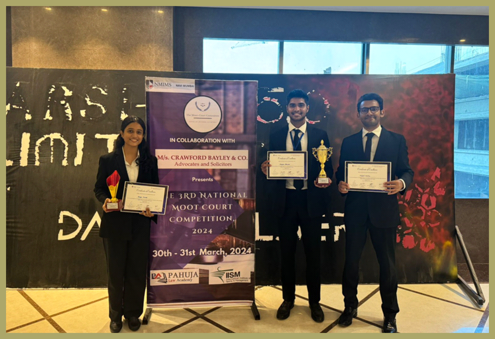 Team Comprising Hrishi Munim,Shayaan Bilawala and Shreya Kawade emerged as the 1st runners'up at the NMIMS Navi Mumbai 3rd National Moot Court Competition conducted on 30 and 31 March 2024