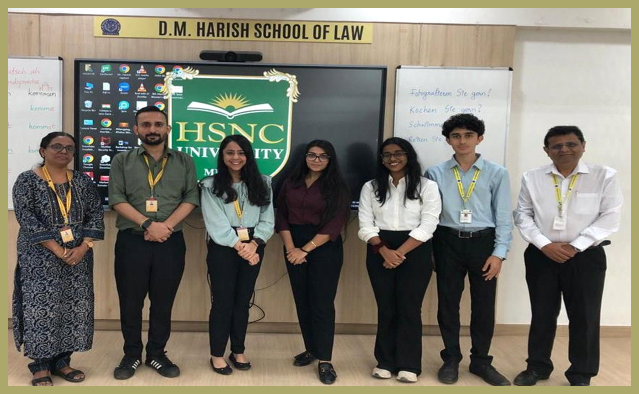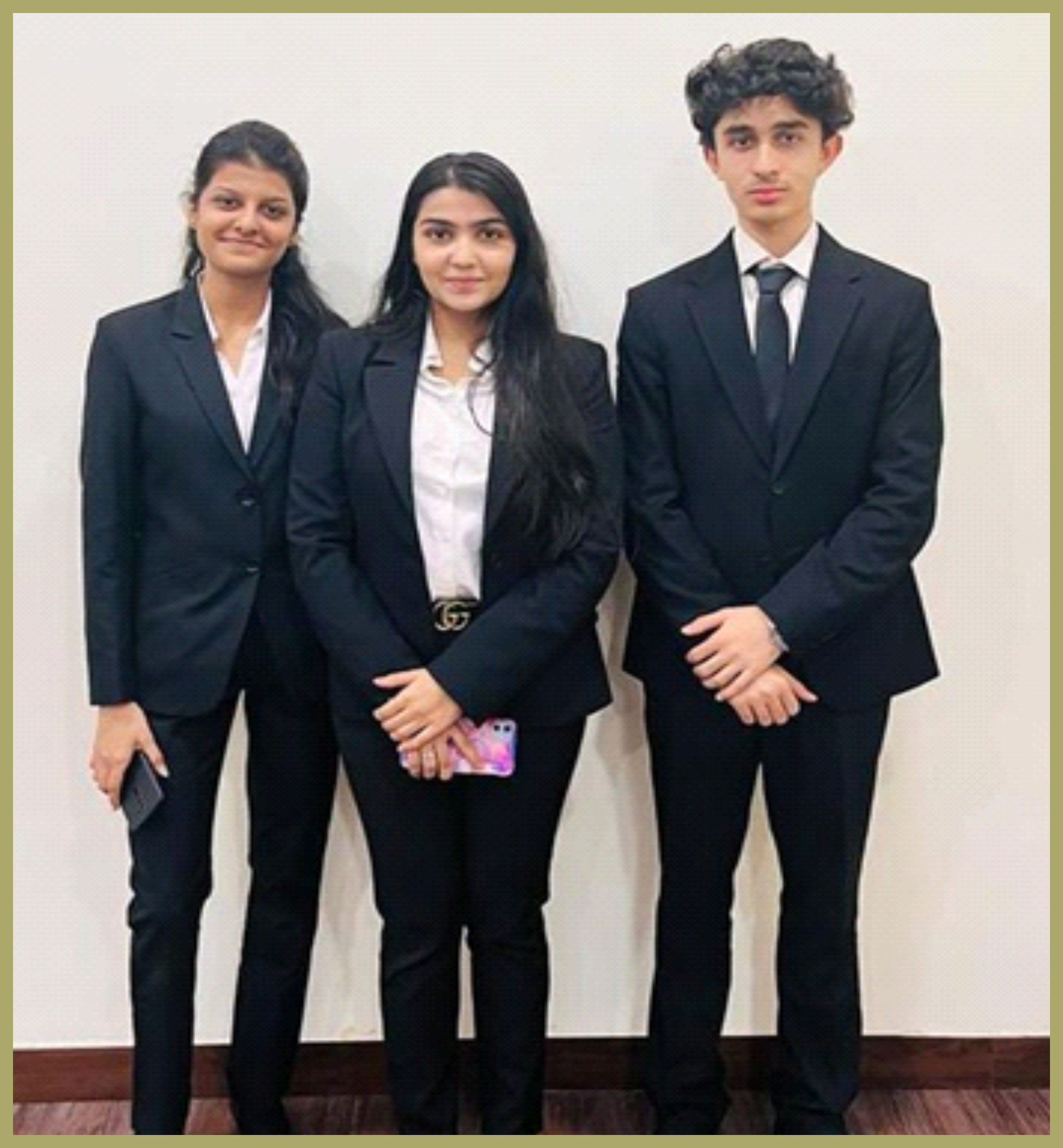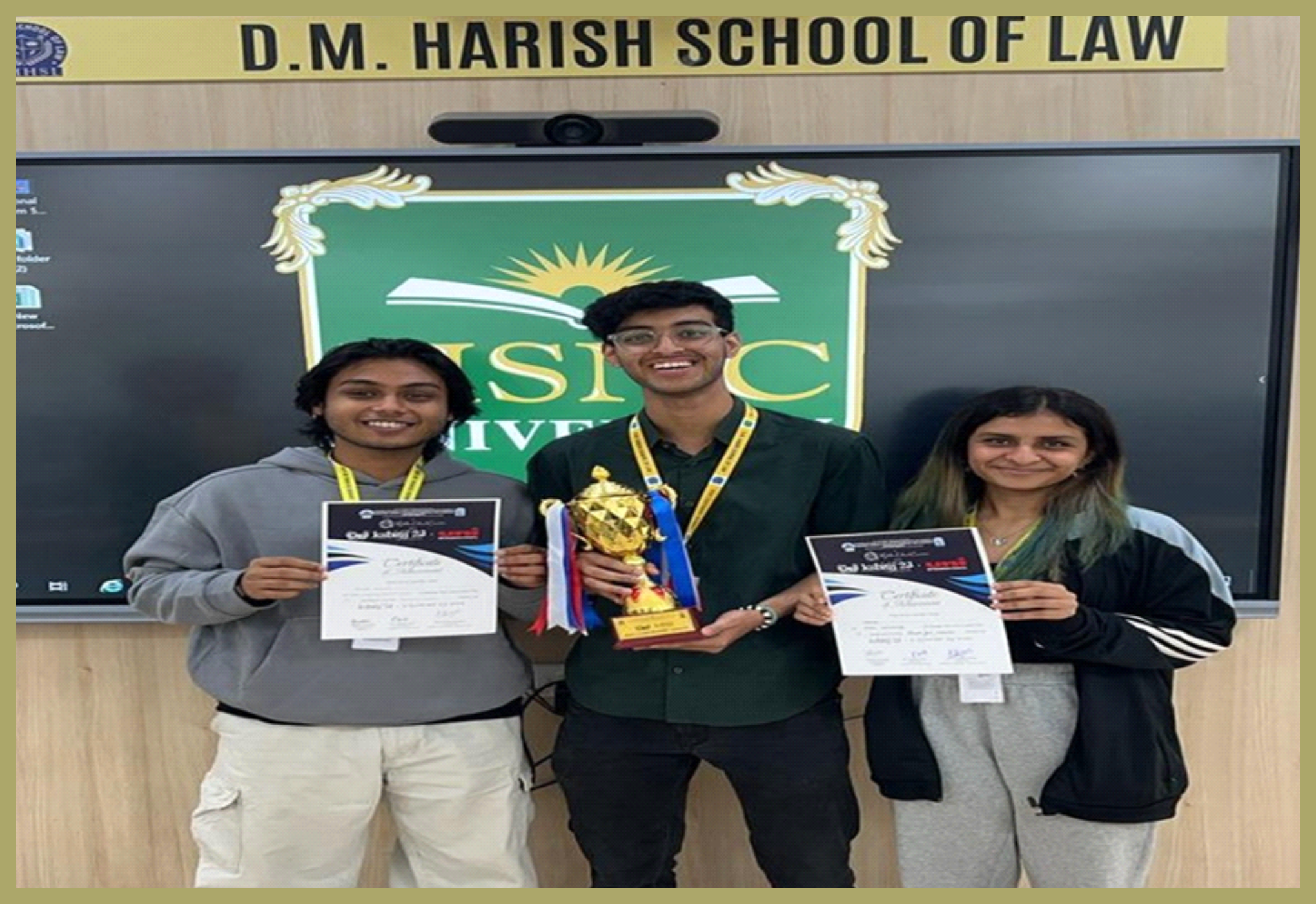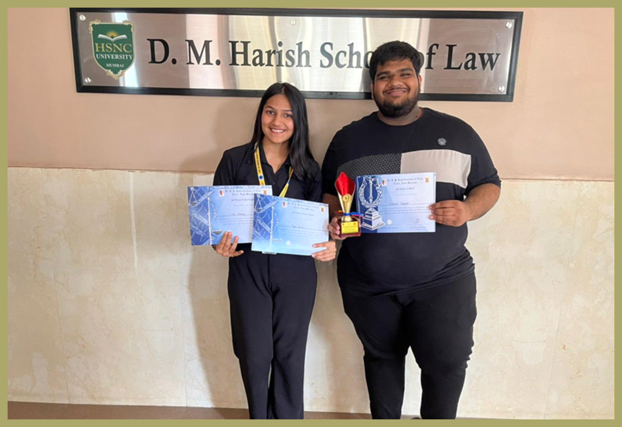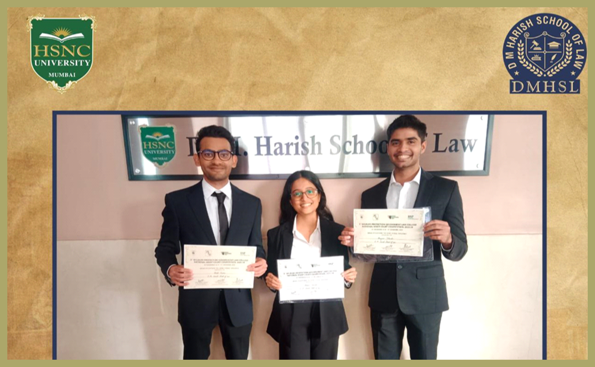 Team Comprising Mr.Aditya Mangaldas,Ms.Naina Abichandani and Ms.Ekta Meghani (Second Year,BB.A.LL.B.(Hons.)program) Progressed to quarter-final rounds of the 25th D.M. Harish Memorial International Moot Court Competition 2024 organised by Government Law College ,Mumbai .They qualified based on their memorials and performance in octa-final and preliminary rounds